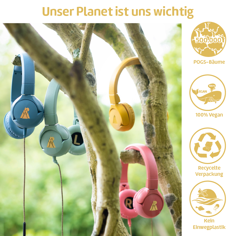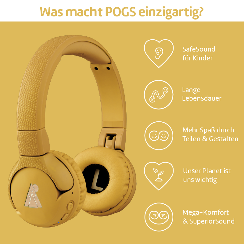 - SafeSound begrenzt die Lautstärke von POGS auf 85 dB, um das Gehör Ihrer Kinder zu schützen.