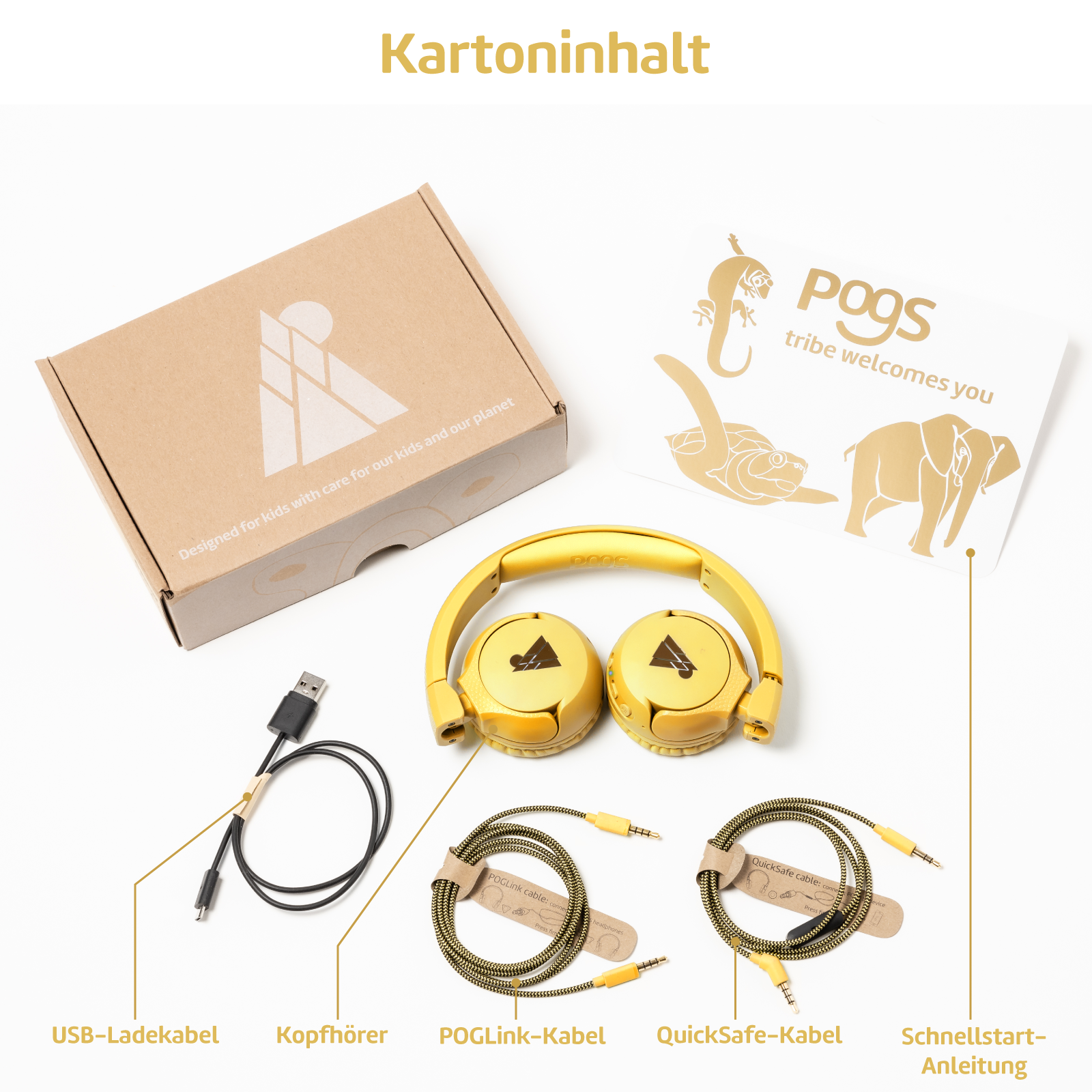 Der ultimative kabellose Kopfhörer für Kinder: sicher, robust, bequem und mit vielen tollen und praktischen Funktionen. 'The Gecko' wird so genannt, weil Ihre Kinder dank der drahtlosen Bluetooth®-Verbindung frei wie ein Gecko klettern können. Der POGS-Kopfhörer 'The Gecko' hat an der Außenseite eine schuppige Struktur, genau wie die Haut eines echten Geckos. Wenn Sie das Aufladen vergessen haben oder beispielsweise im Flugzeug sitzen, können Sie stattdessen jederzeit das QuickSafe-Kabel verwenden. Sowohl das QuickSafe- als auch die POGLink-Textilkabel sind standardmäßig im Lieferumfang enthalten.