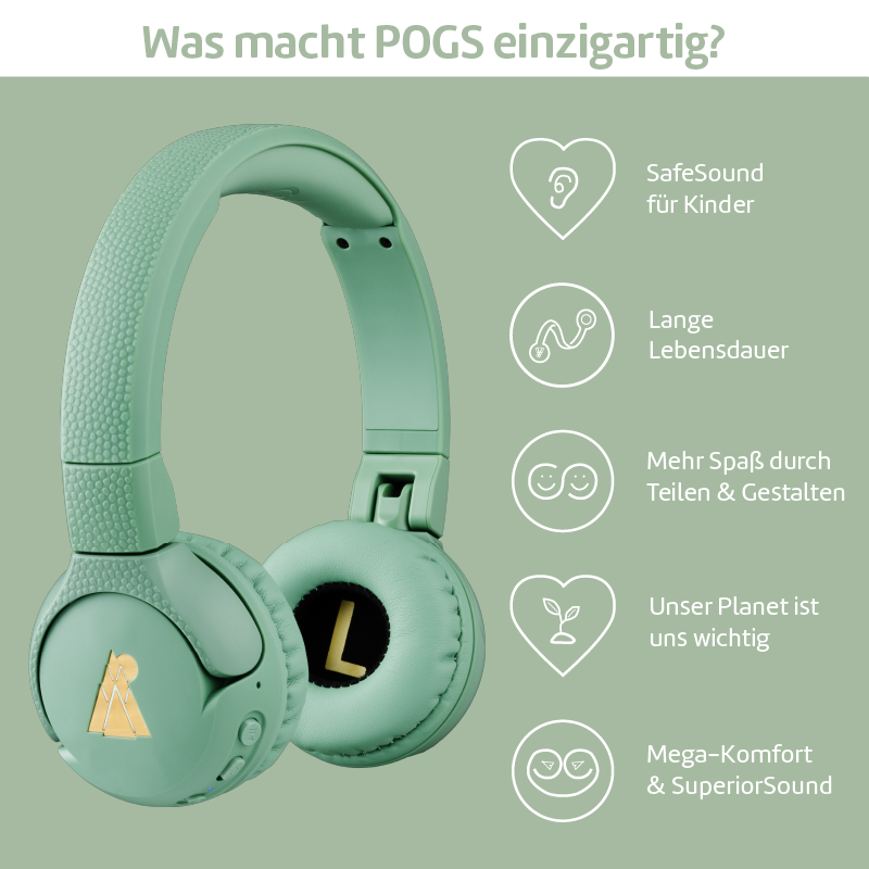 Wir haben (bzw. leider hatten) inzwischen 3 pogs Kopfhörer - bei dem ersten brach nach 1 Jahr die Ohrmuschel ab und wurde getauscht. Der zweite funktioniert weiterhin. Der dritte - und das das ärgerlichste - war die teure Bluetooth Variante. Unser „großer“ war bisher zu klein für die Bedienung von Bluetooth. Jetzt ist er älter und wir wollten es probieren: nichts geht. Verbindung ist da (mehrere Geräte zeigen verbunden an …) aber es kommt nicht ein pieps aus dem Kopfhörer … natürlich etwas älter als 2 Jahre inzwischen. Wir haben bewusst etwas nachhaltiges langlebiges gesucht. Einer musste entsorgt werden und der andere geht nur mit Kabel trotz Bluetooth. Apropo Kabel: die mussten auch bereits getauscht werden, da sie defekt waren. Das Produkt sollte schon der Bedienung durch Kinder standhalten …