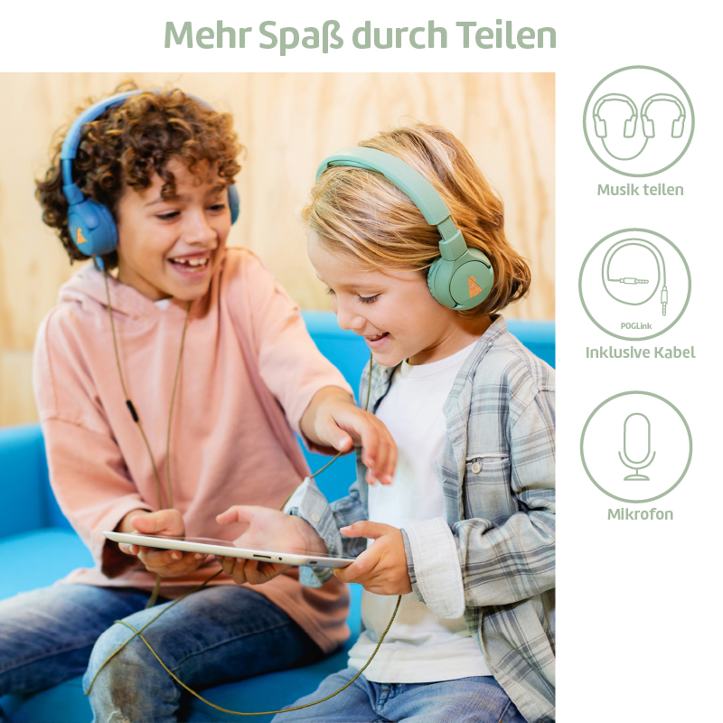 - POGLink-Kabel im Lieferumfang enthalten, um mehrere Kopfhörer miteinander zu verbinden und Musik gemeinsam zu genießen.