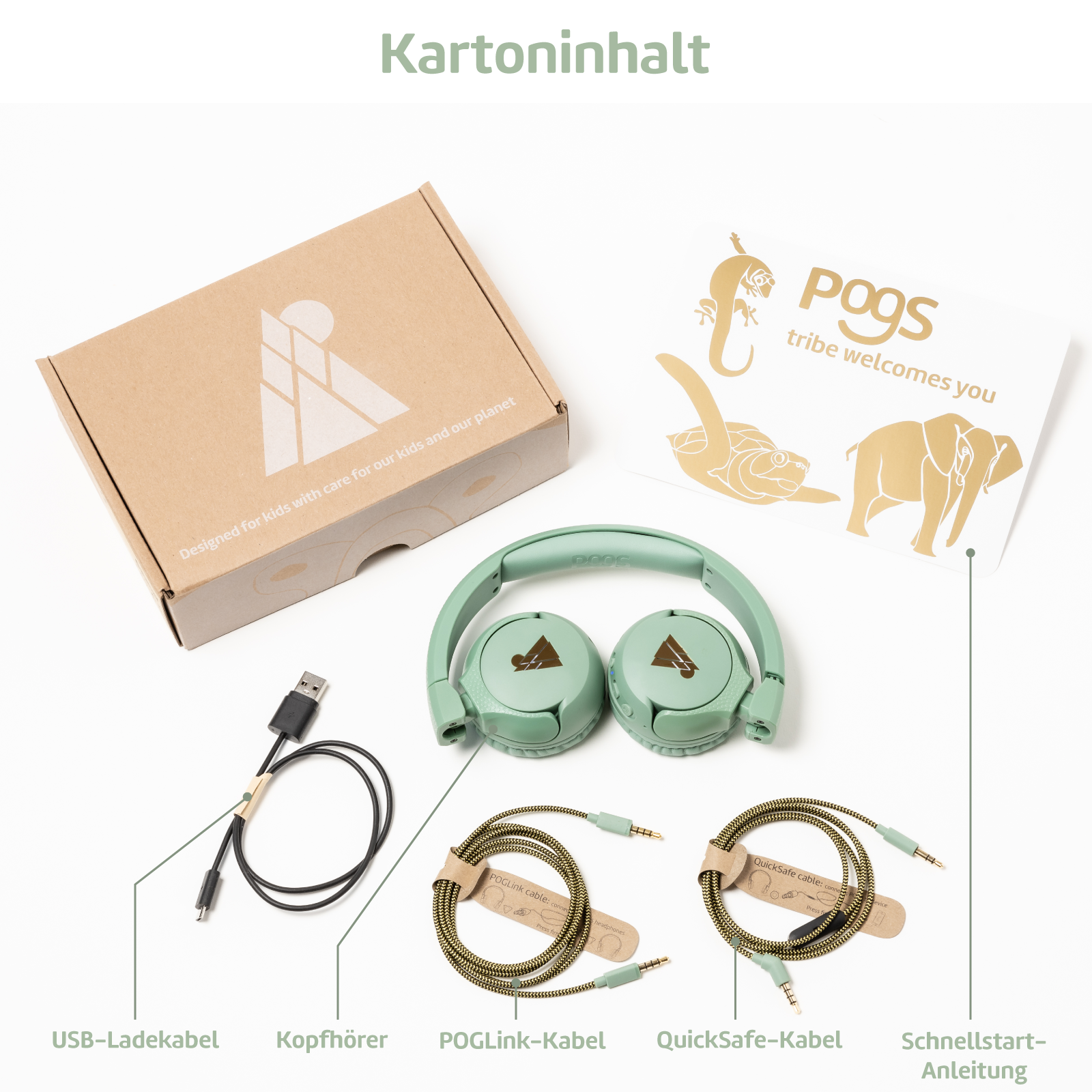 Der ultimative kabellose Kopfhörer für Kinder: sicher, robust, bequem und mit vielen tollen und praktischen Funktionen. 'The Gecko' wird so genannt, weil Ihre Kinder dank der drahtlosen Bluetooth®-Verbindung frei wie ein Gecko klettern können. Der POGS-Kopfhörer 'The Gecko' hat an der Außenseite eine schuppige Struktur, genau wie die Haut eines echten Geckos. Wenn Sie das Aufladen vergessen haben oder beispielsweise im Flugzeug sitzen, können Sie stattdessen jederzeit das QuickSafe-Kabel verwenden. Sowohl das QuickSafe- als auch die POGLink-Textilkabel sind standardmäßig im Lieferumfang enthalten.